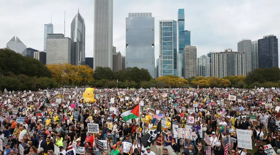 Die Proteste waren nicht nur groß. Sie waren geografisch allgegenwärtig – Ausdruck einer Wut, die tiefer reichte als bloße Parteigegnerschaft. Im Grant Park – benannt nach dem General, der die Union bewahrte – versammelten sich Zehntausende auf demselben Rasen, auf dem wenige Monate zuvor Lollapalooza stattgefunden hatte. Hubschrauberaufnahmen zeigten die Ausdehnung: ein menschlicher Teppich, gesprenkelt mit amerikanischen und mexikanischen Flaggen, Schildern mit „ICE Out“ und „Hands Off“. Manche kamen als Clowns, Drachen oder Einhörner verkleidet. Einer trat als die Eule aus dem alten Tootsie-Pop-Werbespot auf. Der Humor war Strategie, erklärten die Organisatoren – eine Antwort auf eine Regierung, die Städte wie Kriegsgebiete behandelte und Theatralik als Regierungsstil nutzte.