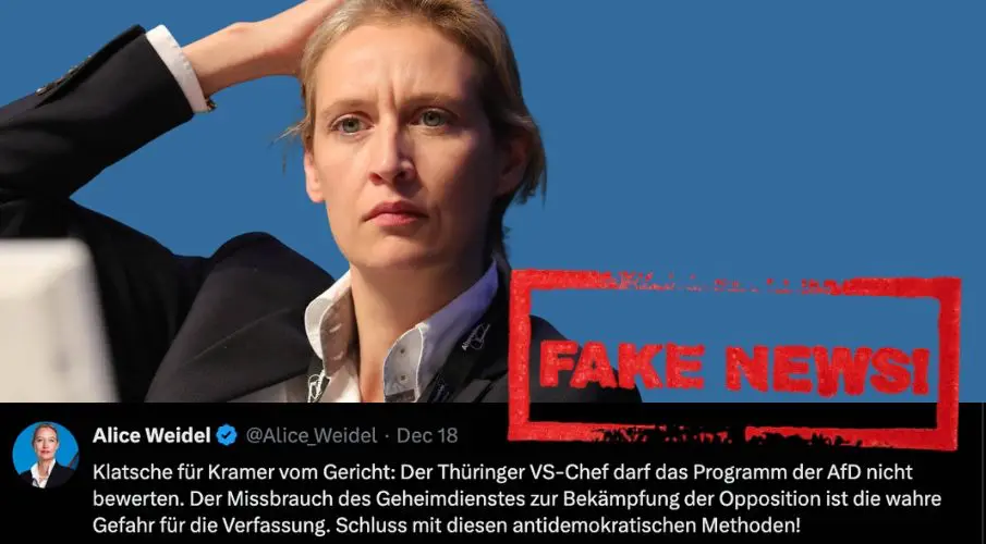 Aus diesem schmalen Randaspekt macht Weidel öffentlich etwas völlig anderes. Sie spricht von einer Niederlage für den Verfassungsschutz, erklärt dessen Arbeit zur Gefahr und stellt den Staat als Täter dar. Das ist nicht durch das Urteil gedeckt. Wer die Entscheidung liest, erkennt sofort: Diese Darstellung ist falsch. Sie lässt zentrale Passagen weg, dreht die Gewichtung um und erzeugt einen Eindruck, der mit der gerichtlichen Feststellung nichts zu tun hat. Damit wird ein weiterer Schritt vollzogen – der Betrug an den eigenen Wählerinnen und Wählern. Ihnen wird suggeriert, ein Gericht habe der AfD im Grundsatz recht gegeben. Tatsächlich hat das Gericht die Klage fast vollständig zurückgewiesen. Diese Diskrepanz ist kein Missverständnis. Sie ist kalkuliert. Ein unbedeutender Nebenpunkt wird aufgeblasen, der Rest verschwiegen. Das sind Fake News als präzise Beschreibung.