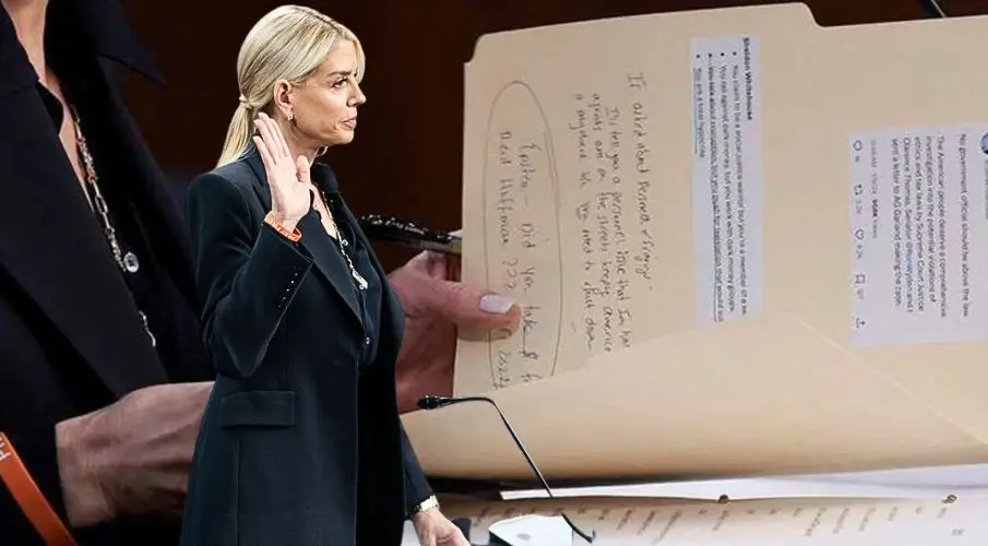 Es gibt Momente, in denen sich Macht unbeabsichtigt selbst entlarvt. Einer dieser Momente ereignete sich während der Anhörung am 7. Oktober 2025 vor dem Justizausschuss des Senats, als Reuters-Fotograf Jonathan Ernst ein unscheinbares, aber entlarvendes Foto machte: Attorney General Pam Bondi, Trumps kompromisslose Justizministerin, hält eine manilafarbene Mappe in der Hand – prall gefüllt mit vorbereiteten Angriffen auf ihre politischen Gegner. Auf der Mappe kleben Ausdrucke von Tweets des demokratischen Senators Sheldon Whitehouse, darunter der Satz: „Kein Regierungsbeamter sollte über dem Gesetz stehen.“ Eine Aussage, die eigentlich wie gemacht wäre für eine Ministerin, deren eigenes Haus unter Verdacht steht, Ermittlungsakten zu Jeffrey Epstein zurückgehalten zu haben. Doch statt sie zu bekräftigen, nutzte Bondi sie offenbar als Vorlage für eine Retourkutsche. Darunter stehen handschriftliche Stichworte, scharf wie Klingen: „Sie geben sich als Kämpfer für soziale Gerechtigkeit aus, aber …“ – „Sie führen eine Scheinuntersuchung durch.“… Es sind keine Notizen einer unabhängigen Juristin, sondern die Zeilen einer Spin-Doktorin, die weiß, wann der Dolch zu sitzen hat.