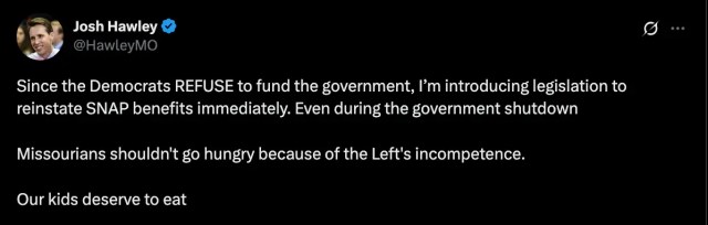 Da die Demokraten sich WEIGERN, die Regierung zu finanzieren, bringe ich ein Gesetz ein, um die SNAP-Leistungen sofort wieder einzusetzen – selbst während des Regierungsstillstands. Die Menschen in Missouri sollten nicht hungern müssen wegen der Inkompetenz der Linken. Unsere Kinder verdienen es zu essen.