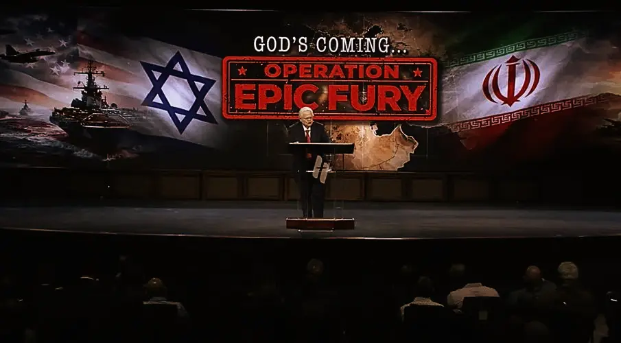 Televangelist John Hagee, Vorsitzender von Christians United for Israel, predigt in seiner Cornerstone Church in San Antonio vor einem Banner mit der Aufschrift „Gott kommt… Operation Epic Fury“. Er dankt Trump dafür, die Feinde Zions zermalmt zu haben, und erklärt, der Angriff auf Iran werde biblisch prophezeite Ereignisse auslösen – die Invasion Israels durch eine russisch geführte Armee und die Niederlage des Antichristen in der Schlacht von Armageddon.