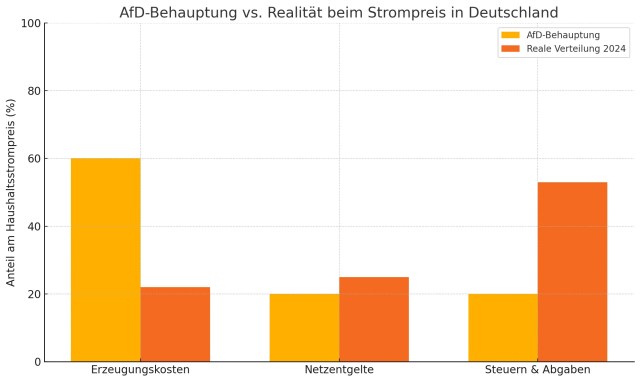 • Die AfD suggeriert, dass die hohen Preise fast nur durch „teure Erzeugung“ entstehen und Kernenergie sofort Abhilfe schaffen würde.